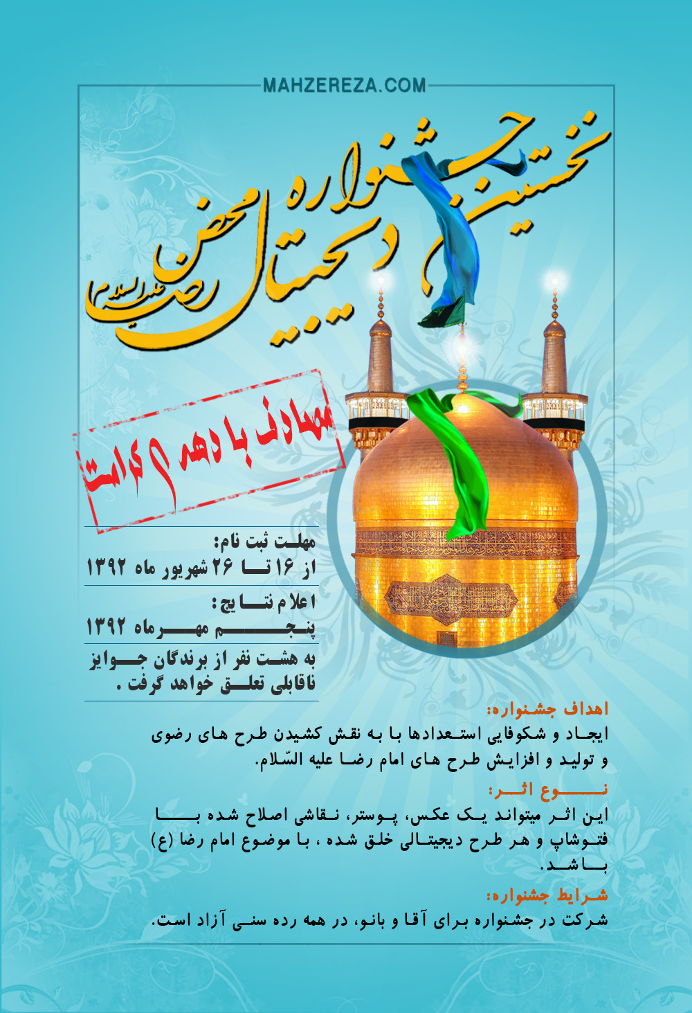 و به لطف و حمد خداوند و یاری آقا امام رضا علیه السّلام، به مناسبت ولادت حضرت معصومه (س) و ولادت حضرت امام رضا (ع)، همزمان با دهه کرامت، پایگاه جامع محـض رضـا علیه السّلام توانسته است مسابقه (جشنواره ای) را برگزار نماید.عنوان جشنواره، جشنواره ی دیجتال محض رضا علیه السّلام می باشد، که متقاضیان و داوطلبان ارجمند، میتوانند تصویر، پوستر، عکس گرفته شده از حرم و هر طرح دیجیتال خلق شده ی رضوی را به عنوان اثر، برای این پایگاه جامع رضوی، ارسال نمایند تا پس از داوری، در صورت برگزیده شدن طرح، جوایزی ناقابل به آنها تعلق گیرد.برای حمایت از ما و این جشنواره، لطفاً یکی از بنرهای ما ( | دریافت کد لوگو | ) را در پایگاه اینترنتی خود درج نمایید.